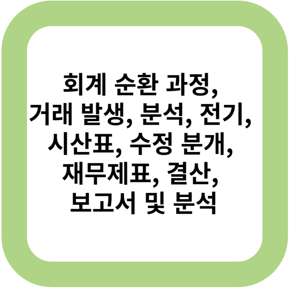 회계 순환 과정, 거래 발생, 분석, 전기, 시산표, 수정 분개, 재무제표, 결산, 보고서 및 분석 결론